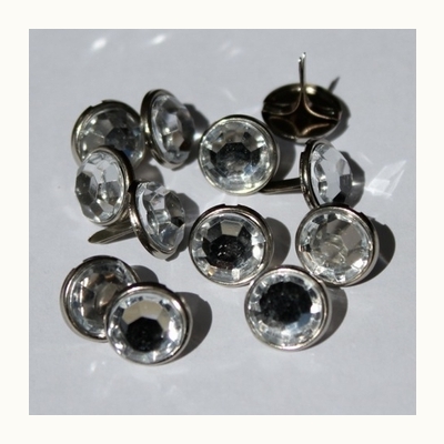 10mm Clear Jewel Brads. Clear stone with silver detail. 12 brads /package. These shiny clear crystall brads are perfect for greeting cards or scrapbook pages. Clear jewel brads are the perfect embellishment for scrapbooking or paper projects.